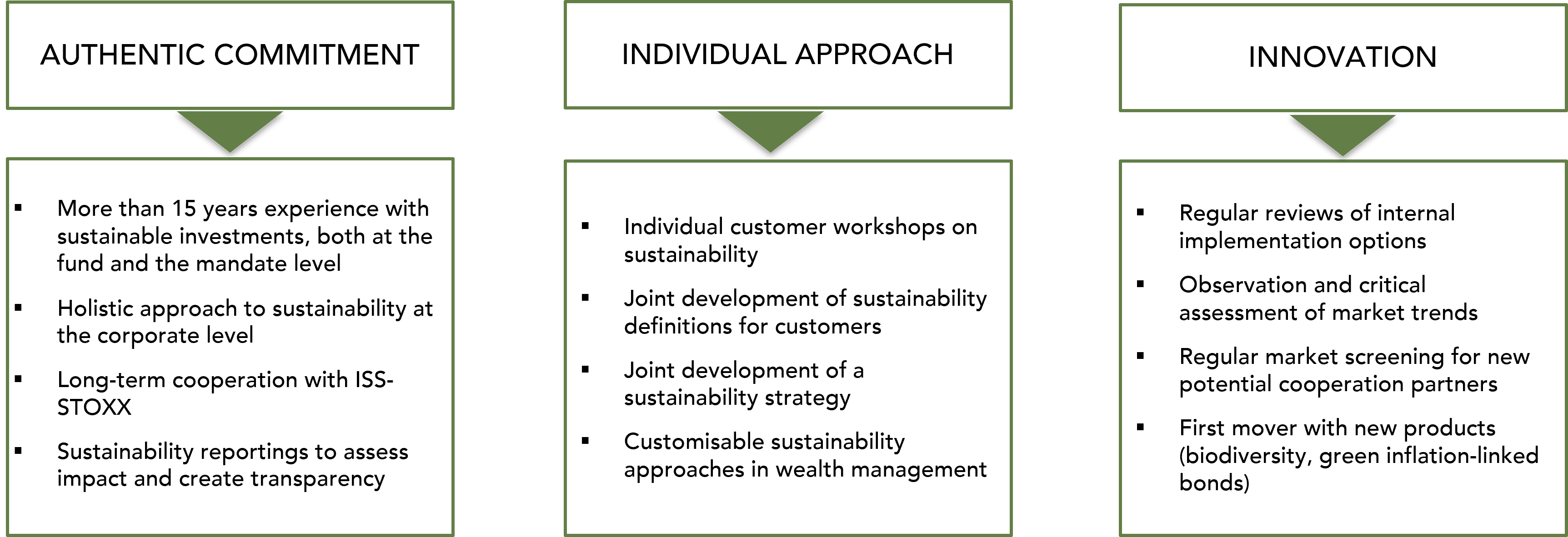 To us, sustainability is not just a buzzword or a convenient marketing tool. Instead, the concept of sustainability is deeply rooted in our corporate identity. We are proud to be one of the first wealth managers to have integrated sustainability in our management and advisory procedures, and by now, we can look back on more than twenty years of expertise in this area.